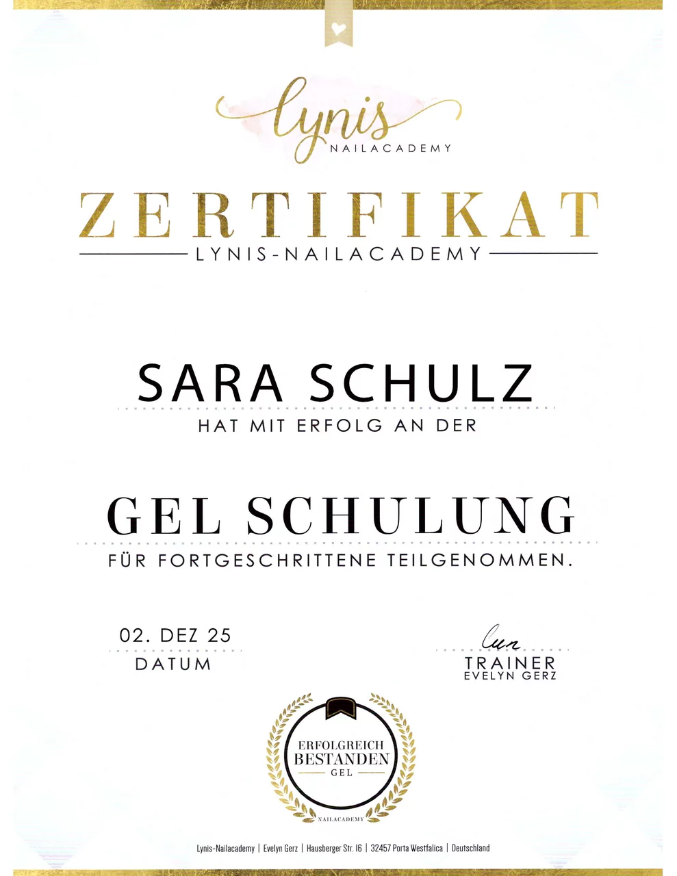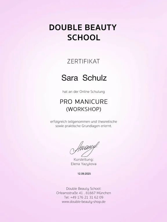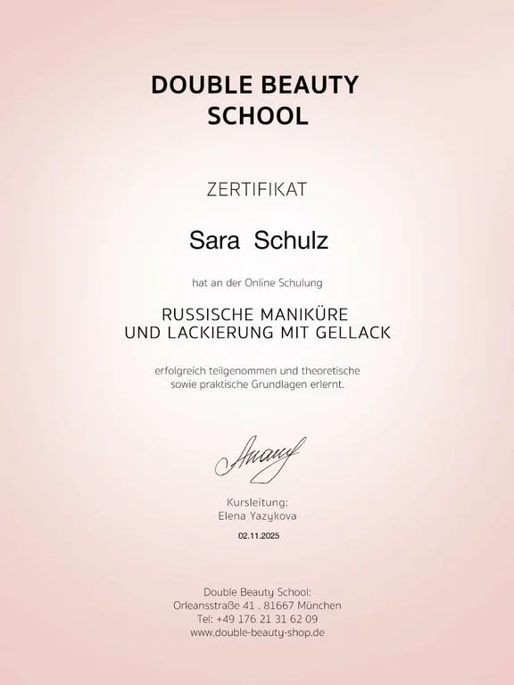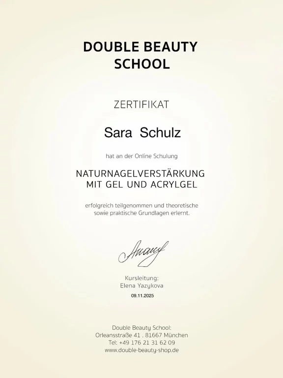 Um mein Wissen zu vertiefen, habe ich im letzten Jahr zusätzlich Online-Schulungen bei der Lynis Nailacademy und Double Beauty mit Erfolg absolviert. Nun freue ich mich, meinen Traum in die Realität umzusetzen und den Schritt in die Selbstständigkeit zu wagen.